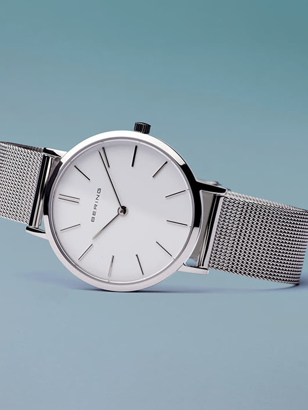 Brand: Bering • Manufacturer no.: 14134-004 • Manufacturer series: Classic 34mm • Functions: Hour, Minute • Movement: Battery (quartz) • Dial color: White • Display: Analog • Water resistant: 3 • Bezel: Fixed • Surface finish: Polished • Case color: Silver • Case material: Stainless steel • Case thickness: 6 • Case width: 34 • Caseback: pressed, Stainless steel bottom • Gender: Ladies • Glas: anti-reflecting, Saphire glass • Style: Classic • Strap material: Stainless steel • Strap color: Silver • Lug width: 16 • Clasp: Clip clasp • Max wrist circumferences: 200 • Item weight: 0.04
