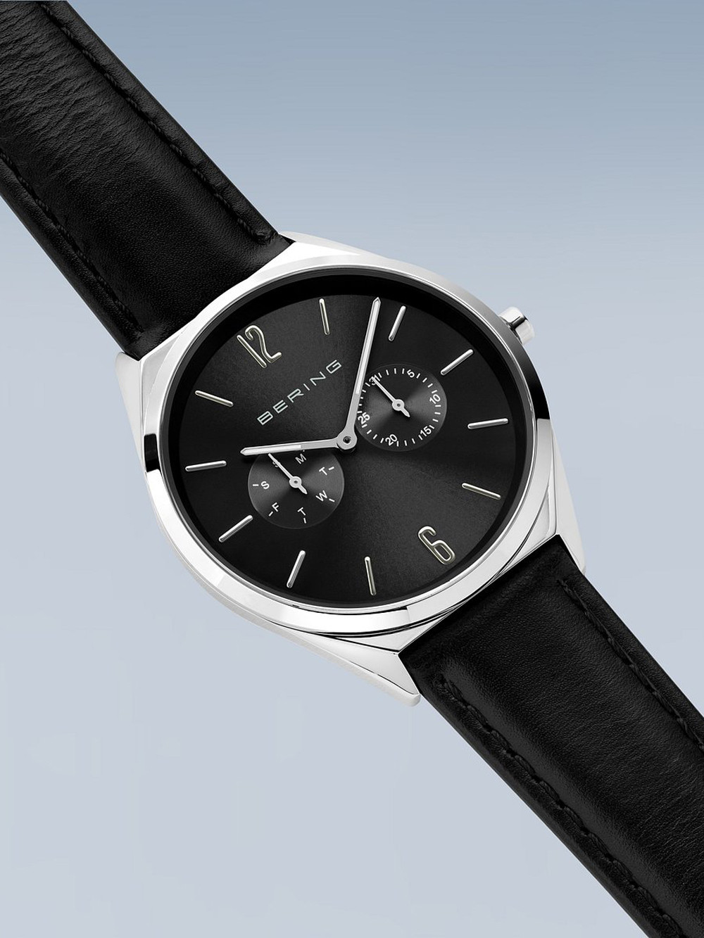• Manufacturer no.: 17140-402 • Manufacturer series: Unisex Ultra Slim 40mm • Functions: Date, Hour, Minute, Second • Movement: Battery (quartz) • Dial color: Black • Display: Analog • Water resistant: 3 • Bezel: Fixed • Surface finish: Polished • Case color: Silver • Case material: Stainless steel • Case thickness: 7 • Case shape: Round • Case width: 40 • Caseback: pressed, Stainless steel bottom • Gender: Ladies, Mens, Unisex • Glas: anti-reflecting, Saphire glass • Lighting: Illumin. hands • Style: Classic • Strap material: Calf leather • Strap color: Black • Lug width: 20 • Clasp: Buckle clasp • Max wrist circumferences: 220 • Item weight: 0.05 • Scope of delivery: Box, Instruction, Packaging, Warranty documents