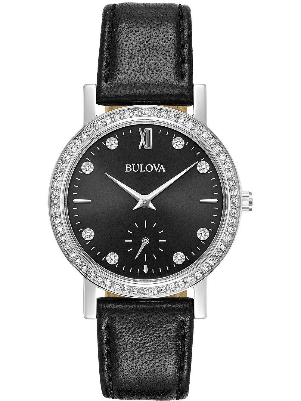Brand: Bulova • Manufacturer no.: 96L246 • Manufacturer series: Classic 32mm • Functions: Hour, Minute, Second • Movement: Battery (quartz) • Movement label: Miyota • Dial color: Black • Display: Analog • Water resistant: 3 • Bezel: Fixed • Surface finish: Matted, Polished • Case color: Silver • Case material: Stainless steel • Case thickness: 7 • Case trimming: Swarovski • Case width: 32 • Caseback: pressed, Stainless steel bottom • Gender: Ladies • Glas: hardened, Mineral glass • Style: Elegant • Strap material: Calf leather • Strap color: Black • Lug width: 16 • Clasp: Buckle clasp • Max wrist circumferences: 185 • Item weight: 0.03