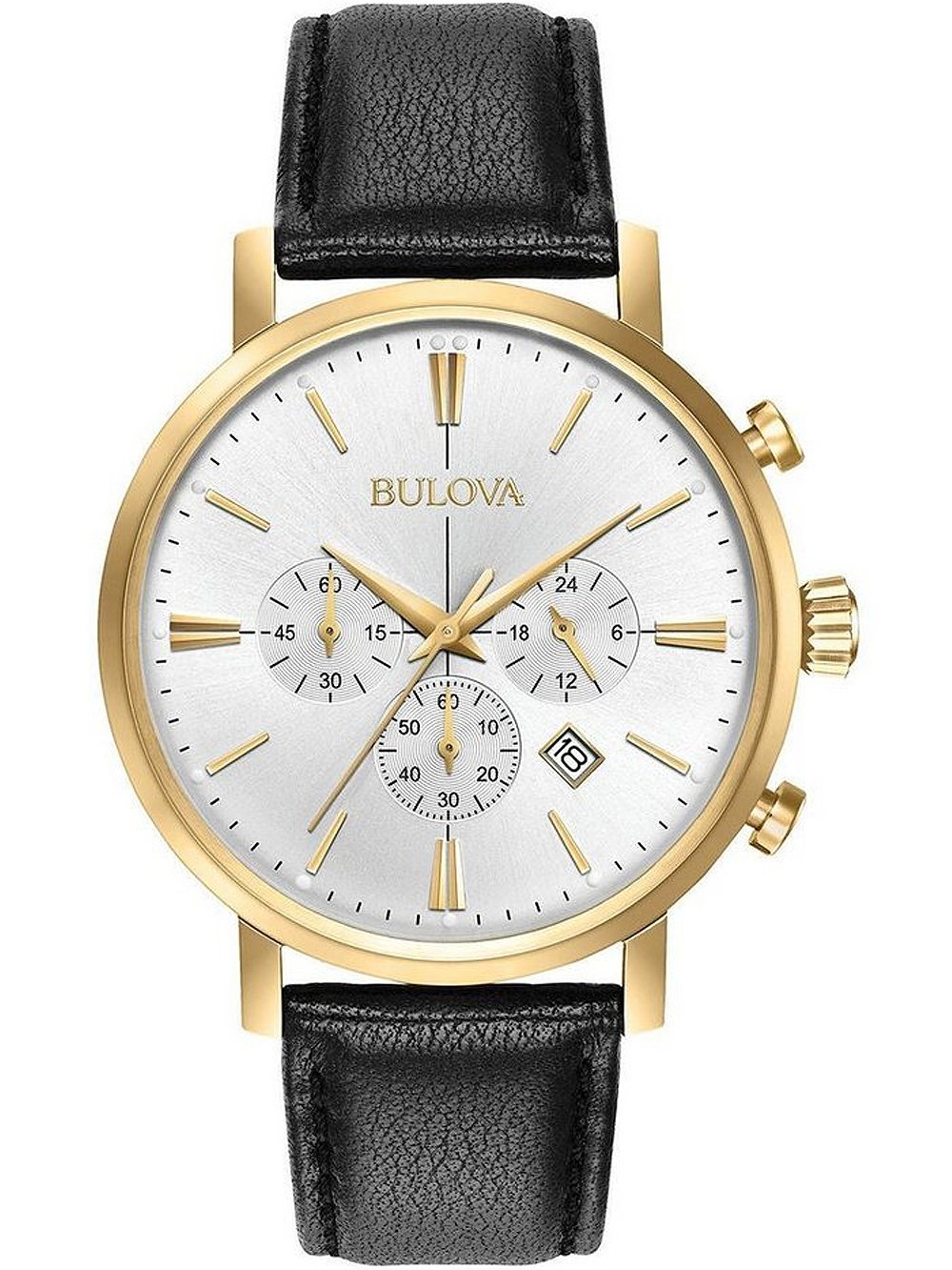 • Manufacturer no.: 97B155 • Manufacturer series: Aerojet Chronograph 41mm • Functions: 24-hours, Chronograph, Date, Hour, Minute, Second • Movement: Battery (quartz) • Dial color: Silver • Display: Analog • Water resistant: 3 • Bezel: Fixed • Surface finish: Matted, Polished • Case color: Gold • Case material: Stainless steel • Case thickness: 11 • Case shape: Round • Case width: 41 • Caseback: pressed, Stainless steel bottom • Gender: Mens • Glas: hardened, Mineral glass • Style: Classic • Strap material: Calf leather • Strap color: Black • Lug width: 20 • Clasp: Buckle clasp • Max wrist circumferences: 220 • Item weight: 0.05 • Scope of delivery: Box, Instruction, Packaging, Warranty documents