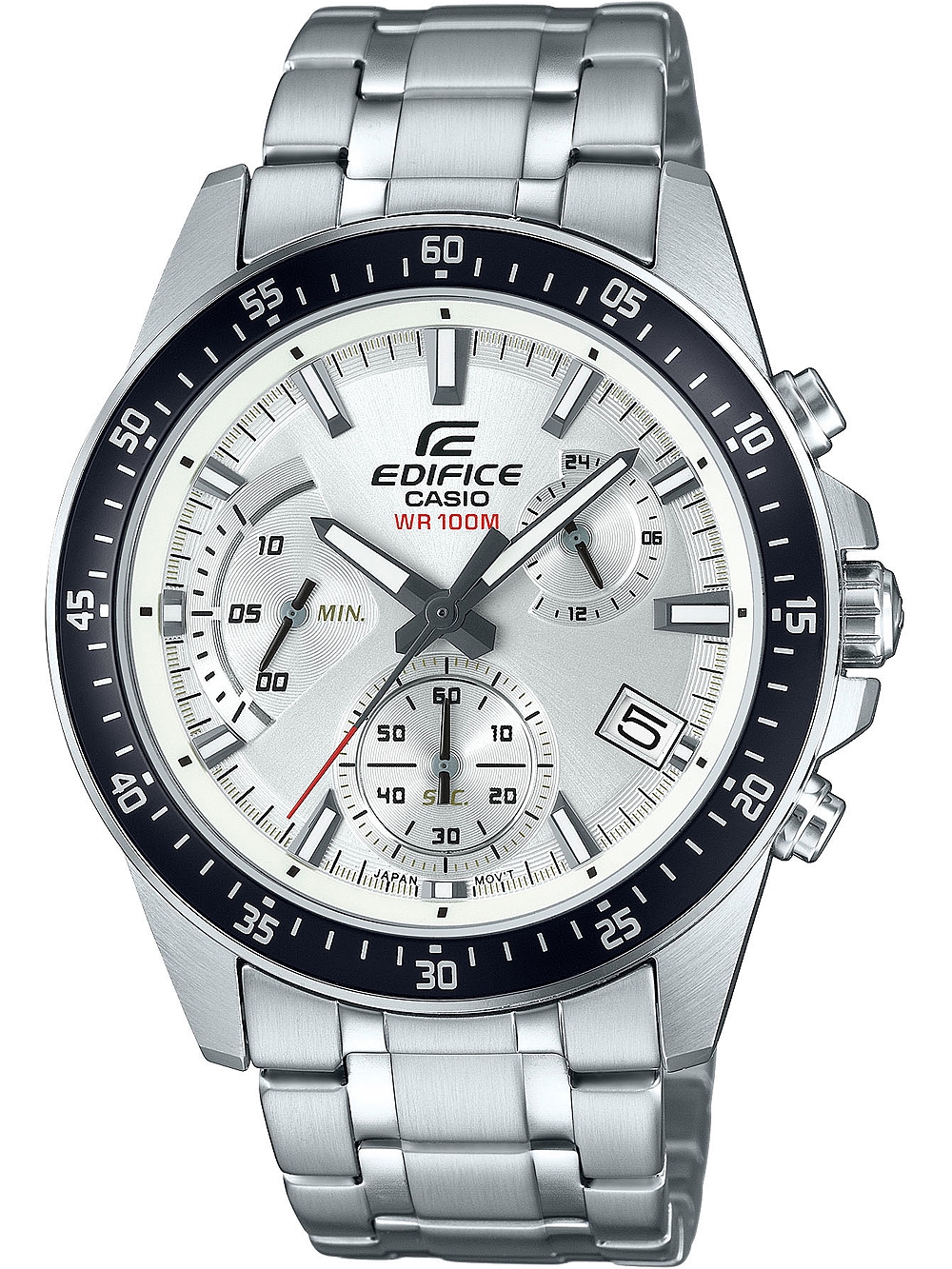 Brand: Casio • Manufacturer no.: EFV-540D-7AVUEF • Manufacturer series: Edifice 44mm • Functions: 24-hours, Chronograph, Date, Hour, Minute, Second • Movement: Battery (quartz) • Dial color: Silver • Display: Analog • Water resistant: 10 • Bezel: Fixed • Surface finish: Matted, Polished • Case color: Silver • Case material: Stainless steel • Case thickness: 12 • Case shape: Round • Case width: 44 • Caseback: screwed, Stainless steel bottom • Gender: Mens • Glas: hardened, Mineral glass • Lighting: Illum. hands, Illum. indexes • Style: Sporty • Strap material: Stainless steel • Strap color: Silver • Lug width: 22 • Clasp: Folding clasp • Max wrist circumferences: 210 • Item weight: 0.14 • Scope of delivery: Box, Instruction, Packaging, Warranty documents"