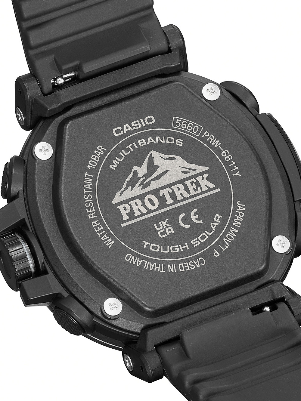 Brand: Casio • Manufacturer no.: PRW-6621Y-1ER • Manufacturer series: Pro Trek Radio Controlled solar 52mm • Functions: 12-/24 time mode, 5 day alarm, Altimeter, autom. time adjusting, Automatic calender, Barometer, cold resistant, Compass, Date, Hour, Minute, Radiocontrolled, Second, Solar, Stop function, Thermometer, Timer, Worldtimer • Movement: Solar (quartz) • Dial color: Black • Display: Analog & digital • Water resistant: 10 • Bezel: Fixed • Surface finish: Matted • Case color: Black • Case material: Resin • Case thickness: 15 • Case shape: Round • Case width: 52 • Caseback: Resin bottom, screwed • Gender: Mens • Crown: Screwed • Glas: hardened, Mineral glass • Lighting: Full-Auto-LED Light • Style: Sporty • Strap material: Resin • Strap color: Black • Lug width: 23 • Clasp: Buckle clasp • Max wrist circumferences: 240 • Item weight: 0.06 • Scope of delivery: Box, Instruction, Packaging, Warranty documents"