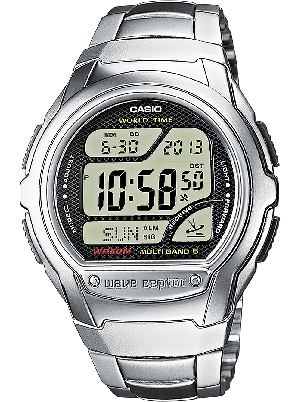Brand: Casio • Manufacturer no.: WV-58DE-1AVEG • Manufacturer series: G-Shock radio controlled 44mm • Functions: 12-/24 time mode, Alarm, Automatic calender, Date, Day, Hour, Minute, Radiocontrolled, Second, Stop function, Timer, Worldtimer • Movement: Battery (quartz) • Dial color: Grey • Display: Digital • Water resistant: 5 • Bezel: Fixed • Surface finish: Matted, Polished • Case color: Silver • Case material: Resin, Stainless steel • Case thickness: 12 • Case width: 44 • Caseback: screwed, Stainless steel bottom • Gender: Mens • Glas: acrylic glass • Lighting: Illuminator • Style: Sporty • Strap material: Stainless steel • Strap color: Silver • Lug width: 23 • Clasp: Folding clasp • Max wrist circumferences: 210 • Item weight: 0.09 • Scope of delivery: Box, Instruction, Packaging, Warranty documents"