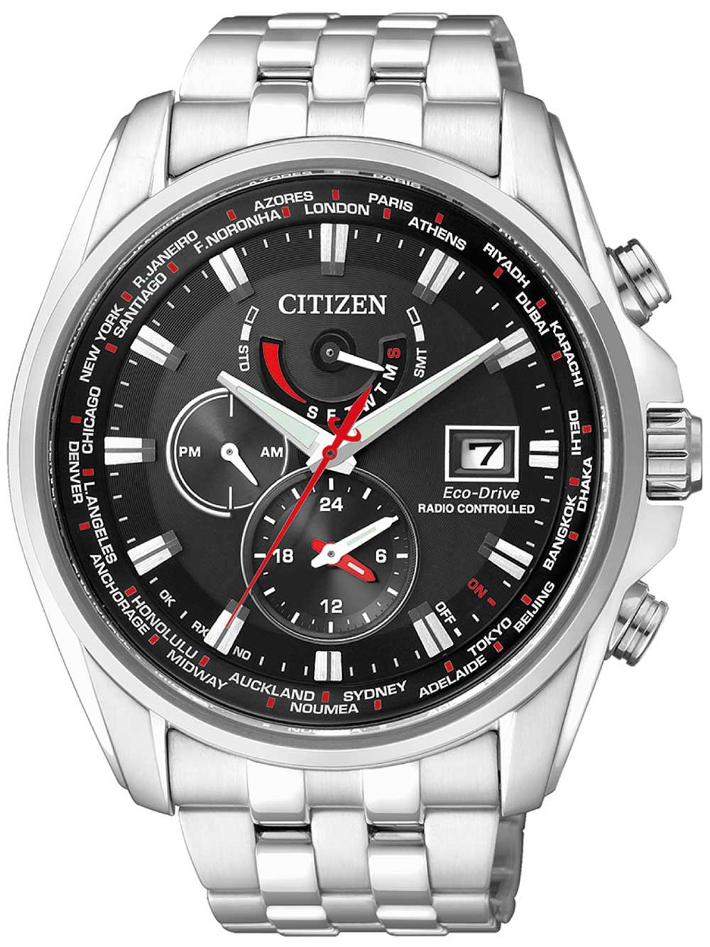 Funkgesteuertes Quarz-Uhrwerk mit Eco-Drive AntriebBis zu 180 Tage Gangreserve nach VollaufladungMassives EdelstahlgehäuseExtrem hartes, kratzfestes, entspiegeltes SaphirglasMassives 5-reihiges Edelstahlarmband?26 Zeitzonen abrufbarWochentag & Datumsanzeige; Perpetual (Ewiger) CalenderWeltzeit24-Stunden AnzeigeFluoreszierende ZeigerGeprüfte WD 20 bar (entspr. ca. 200M Wassersäule)