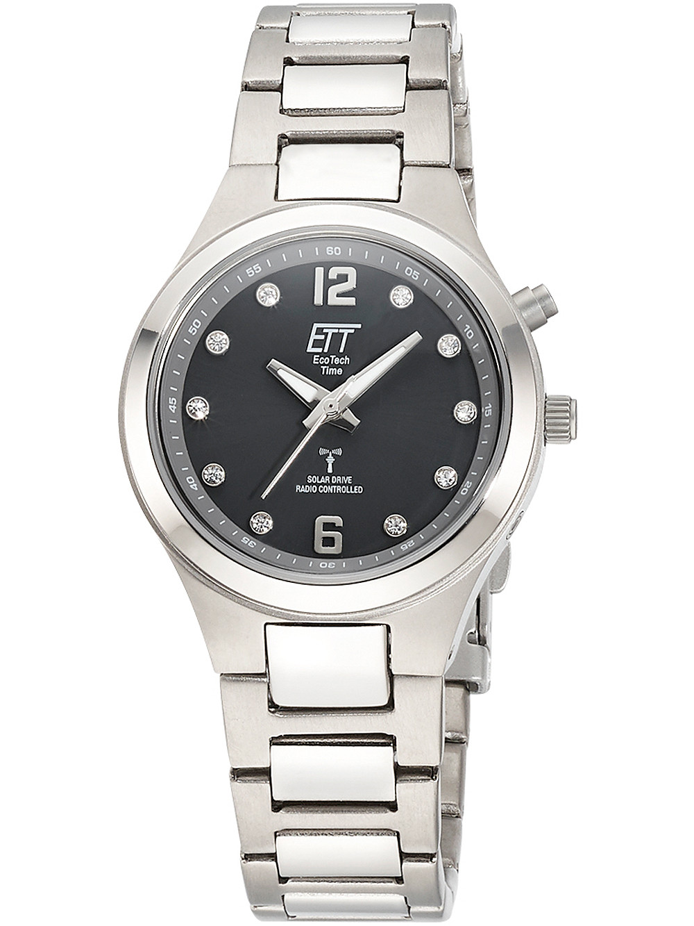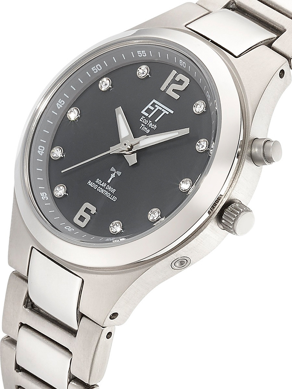 Brand: ETT Eco Tech Time • Manufacturer no.: ELT-11466-24M • Manufacturer series: Everest • Functions: Date, Hour, Minute, Perpetual calendar, Radiocontrolled, Second, Solar, Summertime DST, Overcharge protection • Movement: Solar (quartz) • Movement label: Empfang des Signals DCF 77 (Mainflingen, DE), W328 • Dial color: Black • Display: Analog • Water resistant: 5 • Bezel: Fixed • Surface finish: Matted • Case color: Grey • Case material: Titanium • Case thickness: 11 • Case trimming: Zirconia • Case width: 34 • Caseback: screwed, Titanium bottom • Gender: Ladies • Glas: hardened, Mineral glass • Lighting: Illumin. hands • Style: Classic • Strap material: Titanium • Strap color: Grey • Lug width: 19 • Clasp: Folding clasp • Max wrist circumferences: 185 • Item weight: 0.07