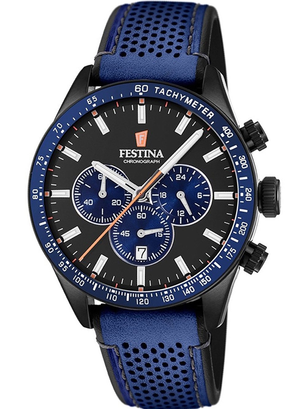 Brand: Festina • Manufacturer no.: F20359/2 • Manufacturer series: Sport chronograph 42mm • Functions: 24-hours, Chronograph, Date, Hour, Minute, Second • Movement: Battery (quartz) • Dial color: Black • Display: Analog • Water resistant: 5 • Bezel: Fixed • Surface finish: Matted, Polished • Case color: Black • Case material: Stainless steel • Case thickness: 11 • Case shape: Round • Case width: 42 • Caseback: pressed, Stainless steel bottom • Gender: Mens • Glas: hardened, Mineral glass • Lighting: Illumin. hands, Illumin. indexes • Style: Sporty • Strap material: Calf leather • Strap color: Blue • Lug width: 21 • Clasp: Buckle clasp • Max wrist circumferences: 220 • Item weight: 0.07 • Scope of delivery: Box, Instruction, Packaging, Warranty documents"