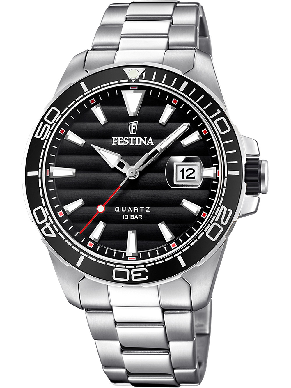Brand: Festina • Manufacturer no.: F20360/2 • Manufacturer series: Prestige 44mm • Functions: Date, Hour, Minute, Second • Movement: Battery (quartz) • Dial color: Black • Display: Analog • Water resistant: 10 • Bezel: counterclockwise, Turnable • Surface finish: Matted, Polished • Case color: Silver • Case material: Stainless steel • Case thickness: 13 • Case shape: Round • Case width: 44 • Caseback: screwed, Stainless steel bottom • Gender: Mens • Glas: hardened, Mineral glass • Lighting: Illumin. hands, Illumin. indexes • Style: Sporty • Strap material: Stainless steel • Strap color: Silver • Lug width: 22 • Clasp: Folding clasp • Max wrist circumferences: 200 • Item weight: 0.15 • Scope of delivery: Box, Instruction, Packaging, Warranty documents"