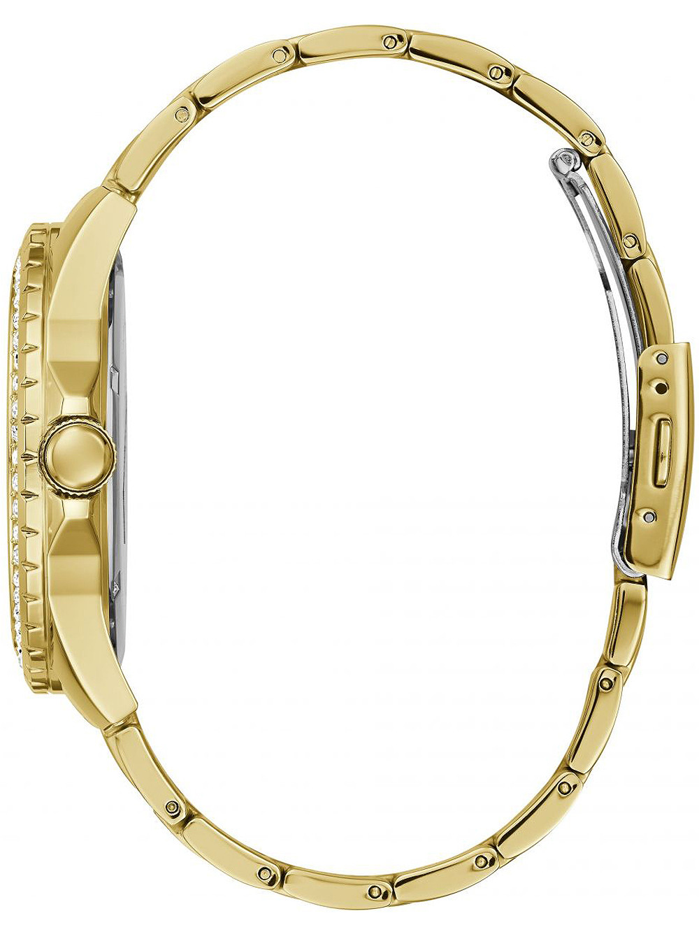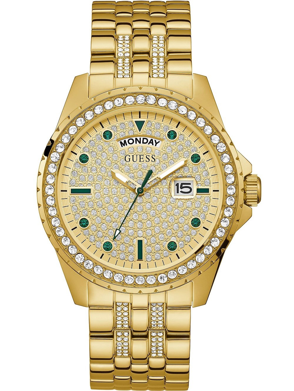 Brand: Guess • Manufacturer no.: GW0218G2 • Manufacturer series: Comet 44mm • Functions: Date, Day, Hour, Minute, Second • Movement: Battery (quartz) • Dial color: Golden • Display: Analog • Water resistant: 5 • Bezel: Fixed • Surface finish: Matted, Polished • Case color: Gold • Case material: Stainless steel • Case thickness: 5 • Case trimming: Zirconia • Case width: 44 • Caseback: screwed, Stainless steel bottom • Gender: Ladies, Mens, Unisex • Glas: hardened, Mineral glass • Lighting: Illumin. hands • Style: Modern • Strap material: Stainless steel • Strap color: Gold • Lug width: 22 • Clasp: Folding clasp • Max wrist circumferences: 195 • Item weight: 0.15