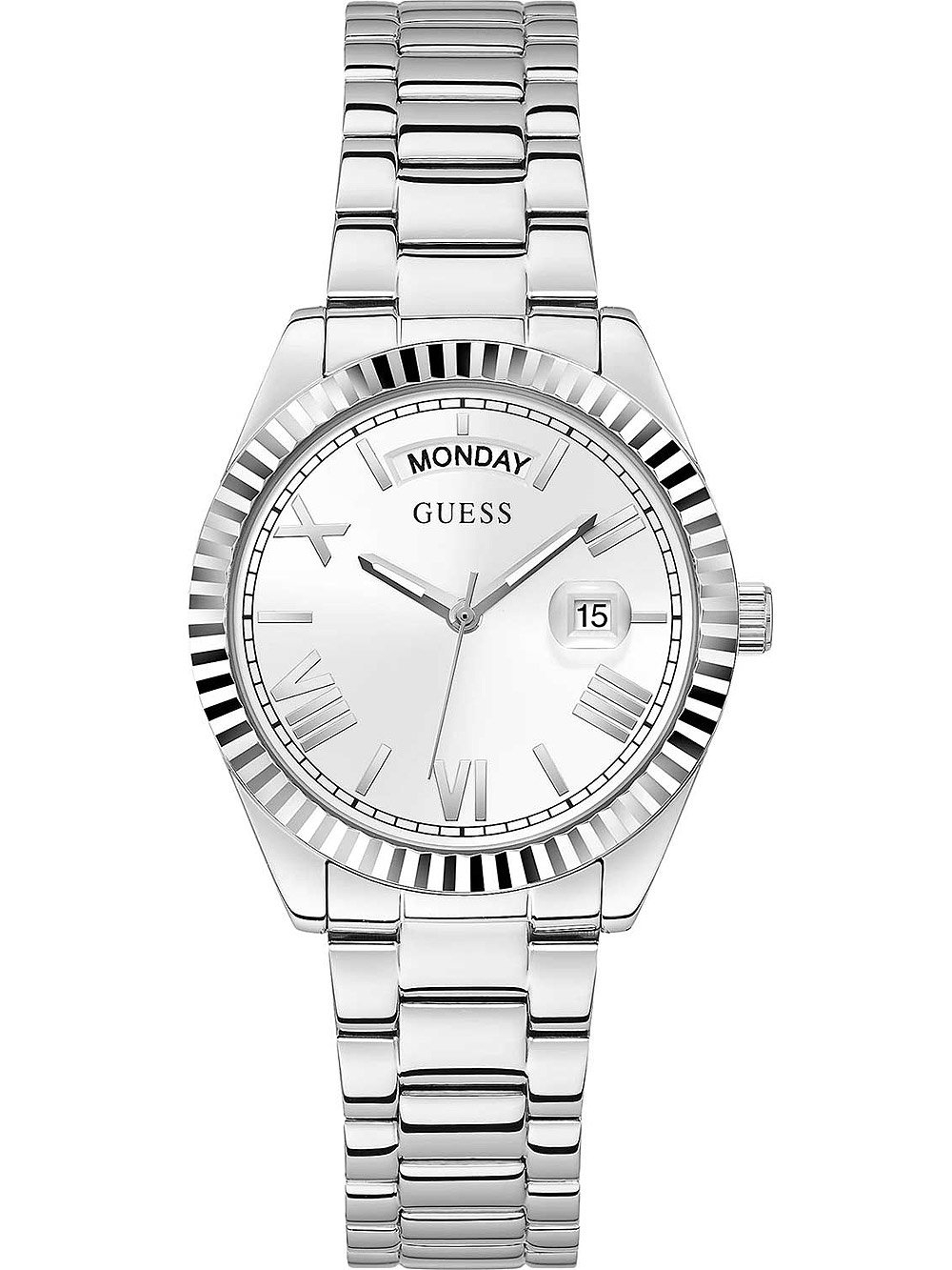 • Manufacturer no.: GW0308L1 • Manufacturer series: Luna Damen 36mm • Functions: Date, Day, Hour, Minute, Second • Movement: Battery (quartz) • Dial color: Silver • Display: Analog • Water resistant: 3 • Bezel: Fixed • Surface finish: Polished • Case color: Silver • Case material: Stainless steel • Case thickness: 9 • Case width: 36 • Caseback: pressed, Stainless steel bottom • Gender: Ladies • Glas: hardened, Mineral glass • Lighting: Illumin. hands • Style: Modern • Strap material: Stainless steel • Strap color: Silver • Lug width: 18 • Clasp: Folding clasp • Max wrist circumferences: 185 • Item weight: 0.10 • Scope of delivery: Box, Instruction, Packaging, Warranty documents