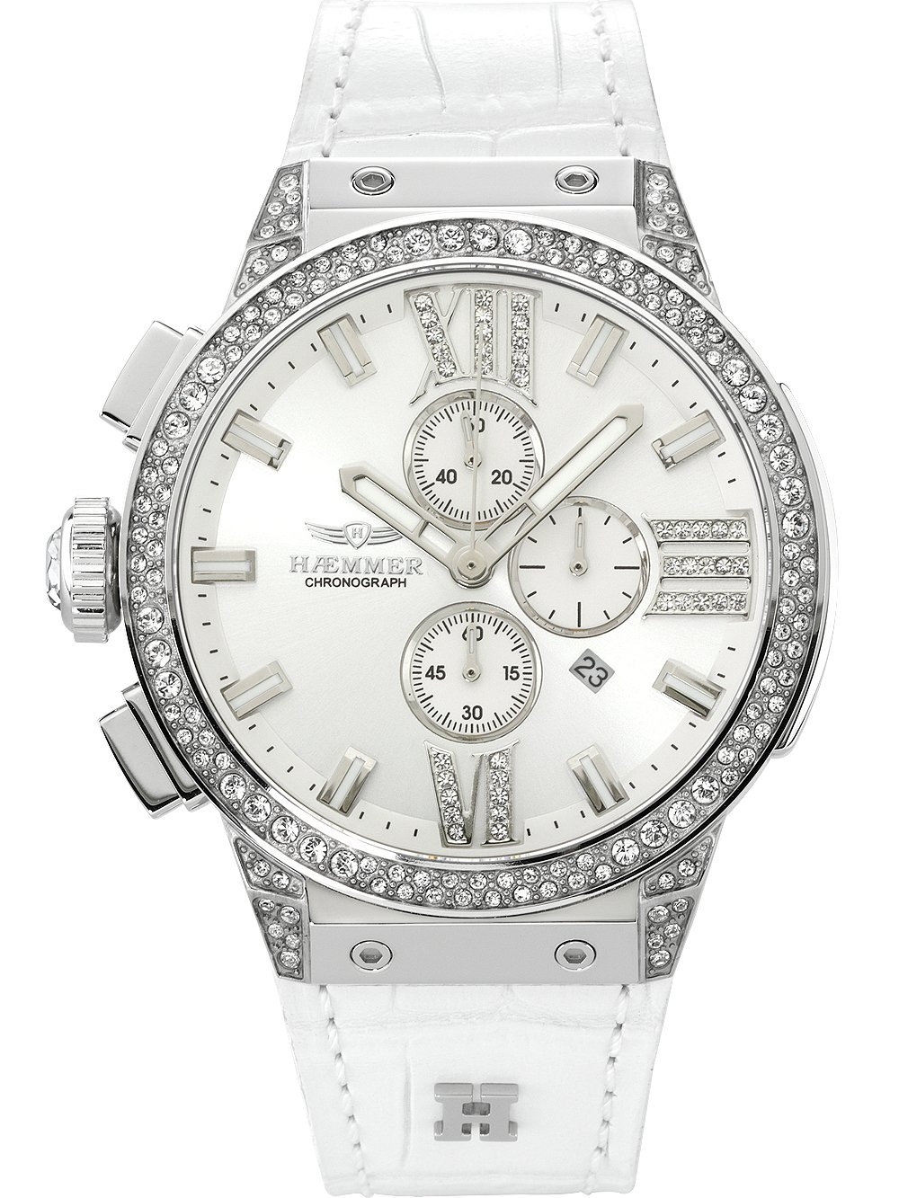 • Manufacturer no.: E-019 • Manufacturer series: White Dream Chrono 45mm • Functions: Chronograph, Date, Hour, Minute, Second • Movement: Battery (quartz) • Movement label: 0S10, Miyota • Dial color: Silver • Display: Analog • Water resistant: 10 • Bezel: Fixed • Surface finish: Matted, Polished • Case color: Silver • Case material: Stainless steel • Case thickness: 14 • Limited edition: X / 999, Yes • Case trimming: Zirconia • Case width: 45 • Caseback: screwed, Stainless steel bottom • Gender: Ladies • Crown: Screwed • Glas: anti-reflecting, Saphire glass • Lighting: Illumin. hands, Illumin. indexes • Style: Fashion • Strap material: Calf leather • Strap color: white • Lug width: 27 • Clasp: Buckle clasp • Max wrist circumferences: 205 • Item weight: 0.13 • Scope of delivery: Box, Instruction, Packaging, Warranty documents
