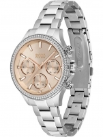 Brand: Hugo Boss Brand: Hugo Boss • Manufacturer no.: 1502565 • Manufacturer series: Hera 38mm • Functions: 24-hours, Date, Day, Hour, Minute, Second • Movement: Battery (quartz) • Dial color: Rosé gold • Display: Analog • Water resistant: 3 • Bezel: Fixed • Surface finish: Matted, Polished • Case color: Silver • Case material: Stainless steel • Case thickness: 11 • Case trimming: Zirconia • Case width: 38 • Caseback: pressed, Stainless steel bottom • Gender: Ladies • Glas: hardened, Mineral glass • Lighting: Illumin. hands, Illumin. indexes • Style: Modern • Strap material: Stainless steel • Strap color: Silver • Lug width: 15 • Clasp: Folding clasp • Max wrist circumferences: 185 • Item weight: 0.10"