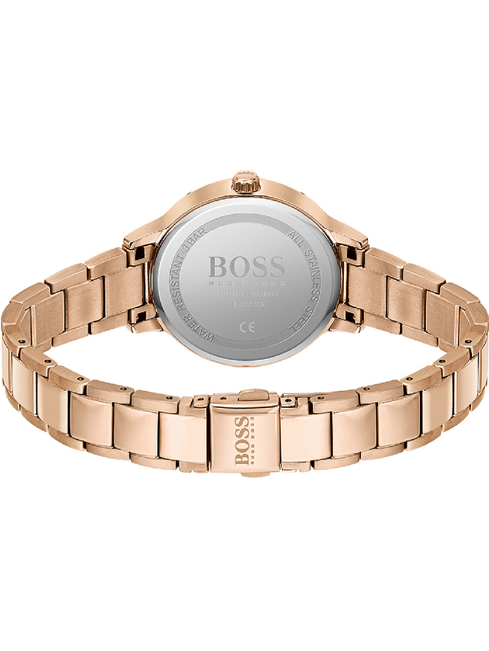 Brand: Hugo Boss Brand: Hugo Boss • Manufacturer no.: 1502582 • Manufacturer series: Faith 34mm • Functions: Hour, Minute, Second • Movement: Battery (quartz) • Dial color: Rosé gold • Display: Analog • Water resistant: 3 • Bezel: Fixed • Surface finish: Matted, Polished • Case color: Rosé gold • Case material: Stainless steel • Case thickness: 8 • Case width: 34 • Caseback: pressed, Stainless steel bottom • Gender: Ladies • Glas: hardened, Mineral glass • Style: Classic • Strap material: Stainless steel • Strap color: Rosé gold • Lug width: 14 • Clasp: Folding clasp • Max wrist circumferences: 185 • Item weight: 0.07"