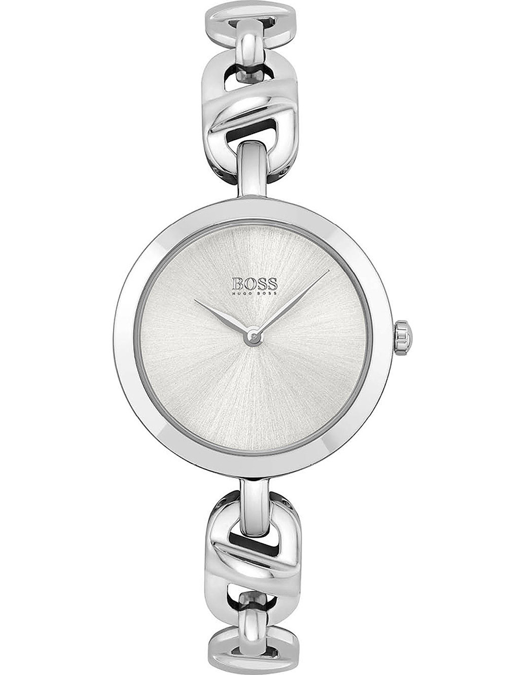 Brand: Hugo Boss • Manufacturer no.: 1502590 • Manufacturer series: New Chain 28mm • Functions: Hour, Minute • Movement: Battery (quartz) • Dial color: Silver • Display: Analog • Water resistant: 3 • Bezel: Fixed • Surface finish: Matted, Polished • Case color: Silver • Case material: Stainless steel • Case thickness: 8 • Case shape: Round • Case width: 28 • Caseback: pressed, Stainless steel bottom • Gender: Ladies • Glas: hardened, Mineral glass • Style: Modern • Strap material: Stainless steel • Strap color: Silver • Lug width: 10 • Clasp: Clip clasp • Max wrist circumferences: 180 • Item weight: 0.04 • Scope of delivery: Box, Instruction, Packaging, Warranty documents"