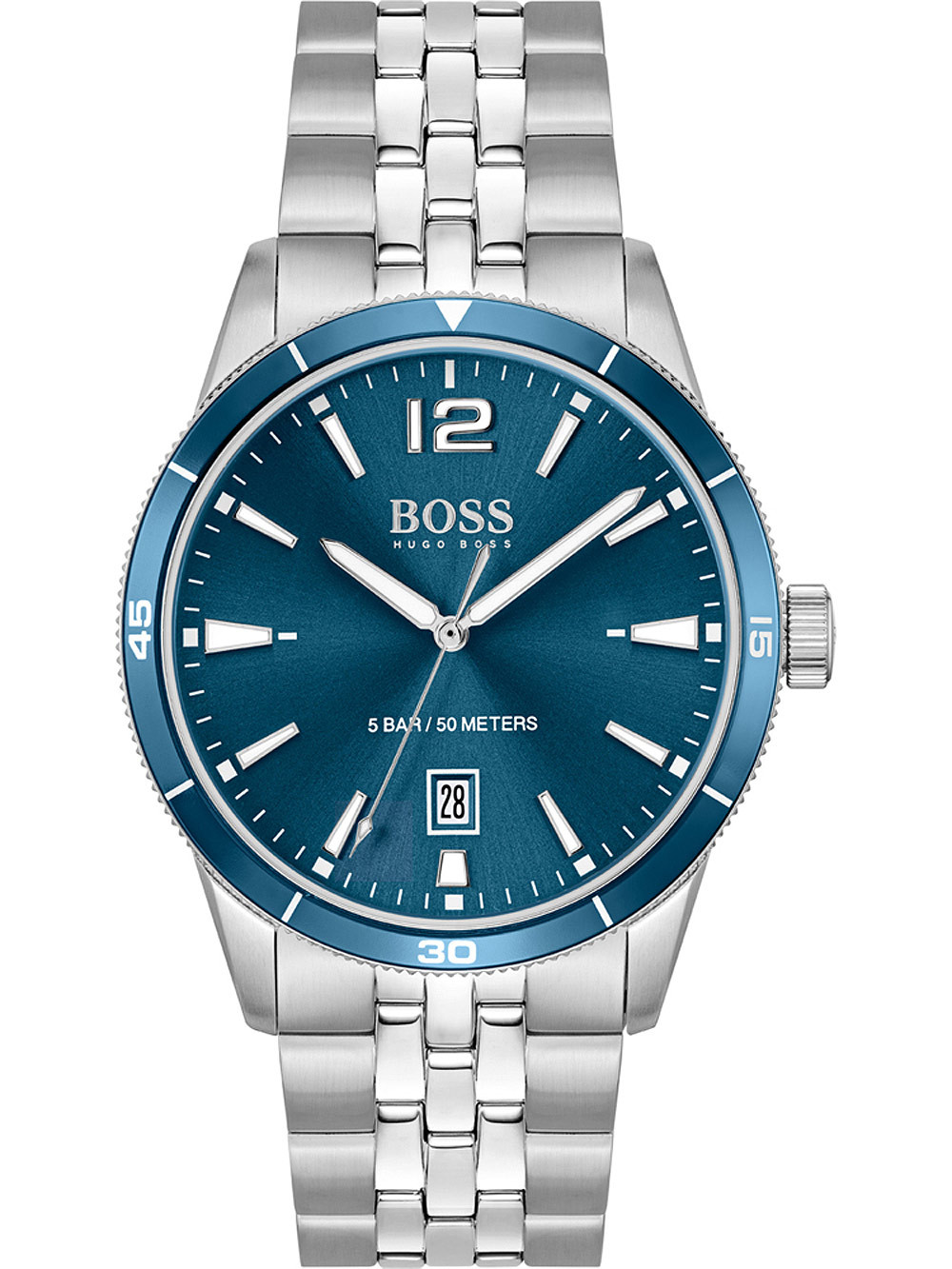 Brand: Hugo Boss • Manufacturer no.: 1513902 • Manufacturer series: Drifter 42mm • Functions: Date, Hour, Minute, Second • Movement: Battery (quartz) • Dial color: Blue • Display: Analog • Water resistant: 5 • Bezel: Fixed • Surface finish: Matted, Polished • Case color: Silver • Case material: Stainless steel • Case thickness: 11 • Case shape: Round • Case width: 42 • Caseback: screwed, Stainless steel bottom • Gender: Mens • Glas: hardened, Mineral glass • Lighting: Illumin. hands, Illumin. indexes • Style: Modern • Strap material: Stainless steel • Strap color: Silver • Lug width: 22 • Clasp: Folding clasp • Max wrist circumferences: 195 • Item weight: 0.13 • Scope of delivery: Box, Instruction, Packaging, Warranty documents"