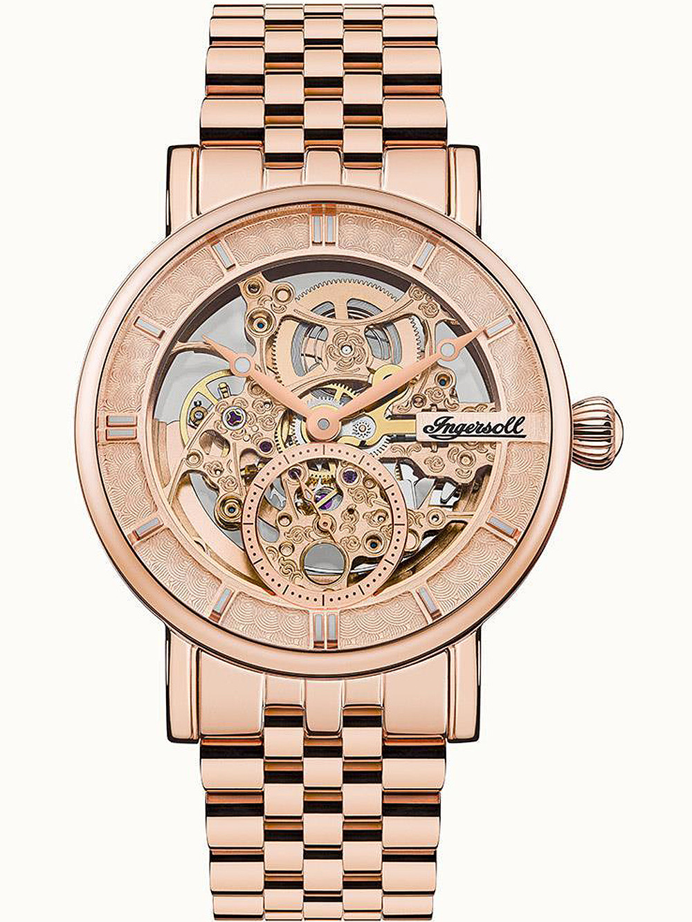 Brand: Ingersoll • Manufacturer no.: I00411 • Manufacturer series: The Herald automatic 40mm I00411 • Functions: Hour, Minute, Second • Movement: Automatic • Dial color: Rosé gold • Display: Analog • Water resistant: 5 • Bezel: Fixed • Surface finish: Polished • Case color: Rosé gold • Case material: Stainless steel • Case thickness: 14 • Case shape: Round • Case width: 40 • Caseback: Glas bottom, screwed • Gender: Mens • Glas: hardened, Mineral glass • Lighting: Illumin. hands, Illumin. indexes • Style: Classic • Strap material: Stainless steel • Strap color: Rosé gold • Lug width: 20 • Clasp: Butterfly clasp • Max wrist circumferences: 210 • Item weight: 0.12 • Scope of delivery: Box, Instruction, Packaging, Warranty documents"