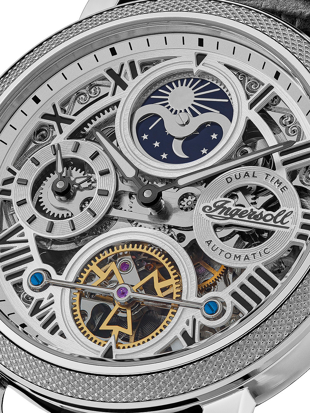 Brand: Ingersoll • Manufacturer no.: I12401 • Manufacturer series: The Row Dual Time automatic 45mm • Functions: 2nd timezone, Hour, Minute, Moon phase • Movement: Automatic • Dial color: Silver • Display: Analog • Water resistant: 5 • Bezel: Fixed • Surface finish: Polished • Case color: Silver • Case material: Stainless steel • Case thickness: 14 • Case width: 45 • Caseback: Glas bottom, screwed • Gender: Mens • Glas: hardened, Mineral glass • Lighting: Illumin. hands • Style: Classic • Strap material: Calf leather • Strap color: Black • Lug width: 22 • Clasp: Buckle clasp • Max wrist circumferences: 225 • Item weight: 0.09 • Scope of delivery: Box, Instruction, Packaging, Warranty documents"