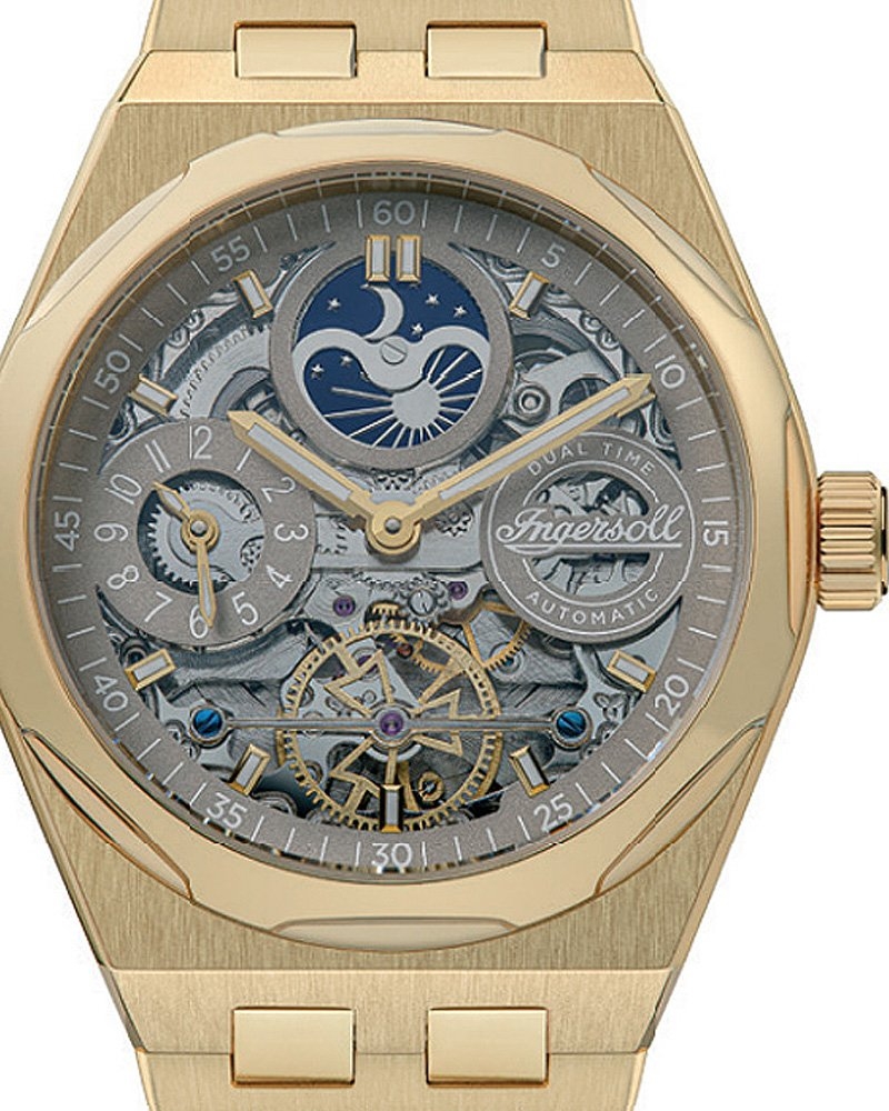 Brand: Ingersoll • Manufacturer no.: I12902 • Manufacturer series: The Broadway Dual Time Automatik 43mm • Functions: 2nd timezone, Hour, Minute, Moon phase • Movement: Automatic • Dial color: Grey, Silver • Display: Analog • Water resistant: 5 • Bezel: Fixed • Surface finish: Matted, Polished • Case color: Gold • Case material: Stainless steel • Case thickness: 15 • Case shape: Round • Case width: 43 • Caseback: Glas bottom, screwed • Gender: Mens • Glas: hardened, Mineral glass • Lighting: Illumin. hands, Illumin. indexes • Style: Classic • Strap material: Stainless steel • Strap color: Gold • Lug width: 26 • Clasp: Butterfly clasp • Max wrist circumferences: 220 • Item weight: 0.18 • Scope of delivery: Box, Instruction, Packaging, Warranty documents"