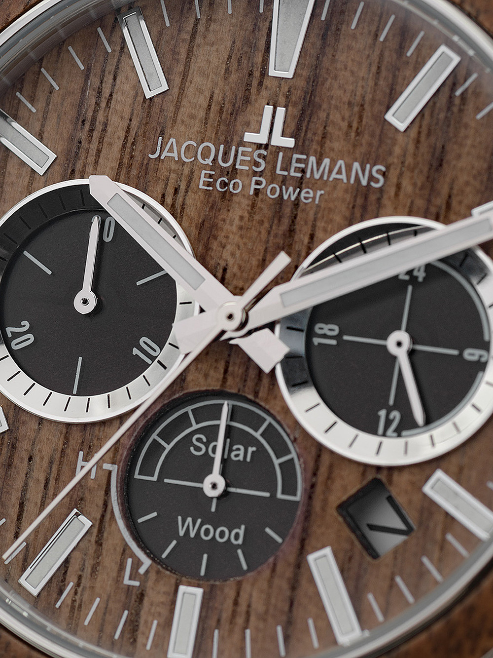 • Manufacturer no.: 1-2115J • Manufacturer series: Eco Power 44mm • Functions: 24-hours, Chronograph, Date, Hour, Minute, Second • Movement: Solar (quartz) • Dial color: Brown • Display: Analog • Water resistant: 10 • Bezel: Fixed • Surface finish: Matted, Polished • Case color: Silver • Case material: Stainless steel • Case thickness: 12 • Case shape: Round • Case width: 44 • Caseback: screwed, Stainless steel bottom • Gender: Mens • Glas: hardened, Mineral glass • Lighting: Illumin. hands, Illumin. indexes • Style: Sporty • Strap material: Stainless steel, Wood • Strap color: Brown, Silver • Lug width: 22 • Clasp: Folding clasp • Max wrist circumferences: 190 • Item weight: 0.14