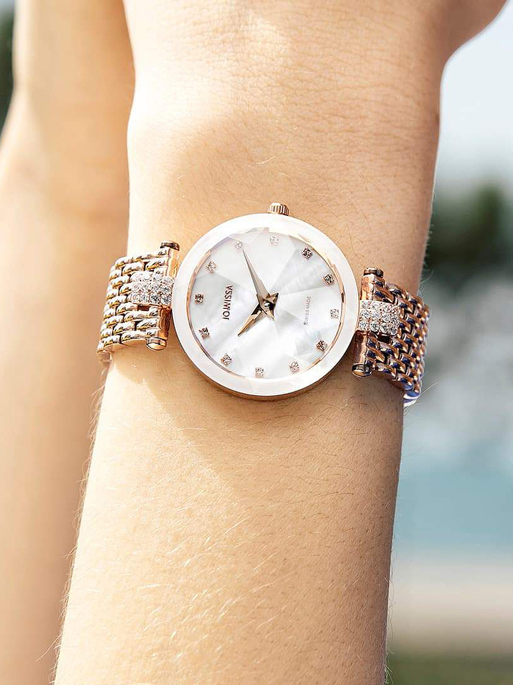 • Manufacturer no.: J5.635.M • Manufacturer series: Facet Strass 29mm • Functions: Hour, Minute • Movement: Battery (quartz) • Movement label: Swiss Made • Dial color: White • Display: Analog • Water resistant: 5 • Bezel: Fixed • Surface finish: Polished • Case color: Rosé gold • Case material: Stainless steel • Case thickness: 9 • Case shape: Round • Case trimming: Zirconia • Case width: 29 • Caseback: pressed, Stainless steel bottom • Gender: Ladies • Glas: hardened, Mineral glass • Style: Elegant • Strap material: Stainless steel • Strap color: Rosé gold • Lug width: 15 • Clasp: Clip clasp • Max wrist circumferences: 200 • Item weight: 0.06 • Scope of delivery: Box, Instruction, Packaging, Warranty documents