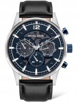 Brand: Police • Manufacturer no.: PEWJF2002801 • Manufacturer series: Pradesh 45mm • Functions: 24-hours, Date, Day, Hour, Minute, Second • Movement: Battery (quartz) • Dial color: Blue • Display: Analog • Water resistant: 5 • Bezel: Fixed • Surface finish: Matted, Polished • Case color: Silver • Case material: Stainless steel • Case thickness: 12 • Case width: 45 • Caseback: screwed, Stainless steel bottom • Gender: Mens • Glas: hardened, Mineral glass • Style: Sporty • Strap material: Calf leather • Strap color: Black • Lug width: 24 • Clasp: Buckle clasp • Max wrist circumferences: 220 • Item weight: 0.07