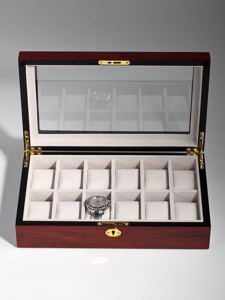 Exklusive, abschliessbare Uhrenschatulle mit Glasdeckel von Rothenschild aus Holz zur Aufbewahrung von bis zu 12 Uhren. Die einzelnen Fächer bieten ausreichend Platz für Uhren mit einem Durchmesser von bis zu ca. 53 mm. Uhren Accessoires von Rothenschild bieten eine exzellente Verarbeitungsqualität bei einem hervorragendem Preis-, Leistungsverhältnis.