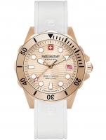 Brand: Swiss Military Hanowa • Manufacturer no.: 06-6338.09.010 • Manufacturer series: Offshore Diver Lady 38mm • Functions: Date, Hour, Minute, Second • Movement: Battery (quartz) • Movement label: 715, Ronda • Dial color: Rosé gold • Display: Analog • Water resistant: 20 • Bezel: counterclockwise, Turnable • Surface finish: Matted, Polished • Case color: Rosé gold • Case material: Stainless steel • Case thickness: 11 • Case width: 38 • Caseback: screwed, Stainless steel bottom • Gender: Ladies • Crown: Screwed • Glas: anti-reflecting, Saphire glass • Lighting: Illumin. hands, Illumin. indexes • Style: Sporty • Strap material: Silicon • Strap color: white • Lug width: 18 • Clasp: Buckle clasp • Max wrist circumferences: 185 • Item weight: 0.08