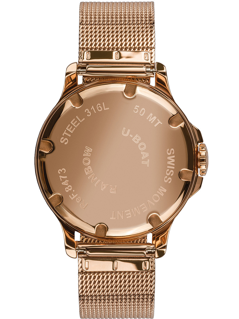 Brand: U-Boat • Manufacturer no.: 8473/MT • Manufacturer series: Rainbow 38mm • Functions: Hour, Minute • Movement: Battery (quartz) • Movement label: Swiss Made • Dial color: Mother of pearl, Pink • Display: Analog • Water resistant: 5 • Bezel: Fixed • Surface finish: Polished • Case color: Rosé gold • Case material: Stainless steel • Case thickness: 16 • Case trimming: Glass crystal • Case width: 38 • Caseback: screwed, Stainless steel bottom • Gender: Ladies • Crown: Screwed • Glas: anti-reflecting, Saphire glass • Style: Modern • Strap material: Stainless steel • Strap color: Rosé gold • Lug width: 18 • Clasp: Clip clasp • Max wrist circumferences: 190 • Item weight: 0.08