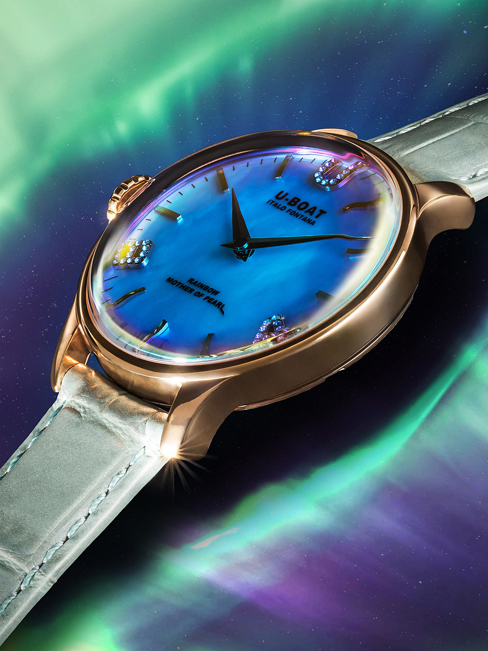 Brand: U-Boat • Manufacturer no.: 8475 • Manufacturer series: Rainbow 38mm • Functions: Hour, Minute • Movement: Battery (quartz) • Movement label: Swiss Made • Dial color: Blue, Mother of pearl • Display: Analog • Water resistant: 5 • Bezel: Fixed • Surface finish: Polished • Case color: Rosé gold • Case material: Stainless steel • Case thickness: 16 • Case trimming: Glass crystal • Case width: 38 • Caseback: screwed, Stainless steel bottom • Gender: Ladies • Crown: Screwed • Glas: anti-reflecting, Saphire glass • Style: Modern • Strap material: Calf leather • Strap color: Blue • Lug width: 18 • Clasp: Buckle clasp • Max wrist circumferences: 190 • Item weight: 0.06