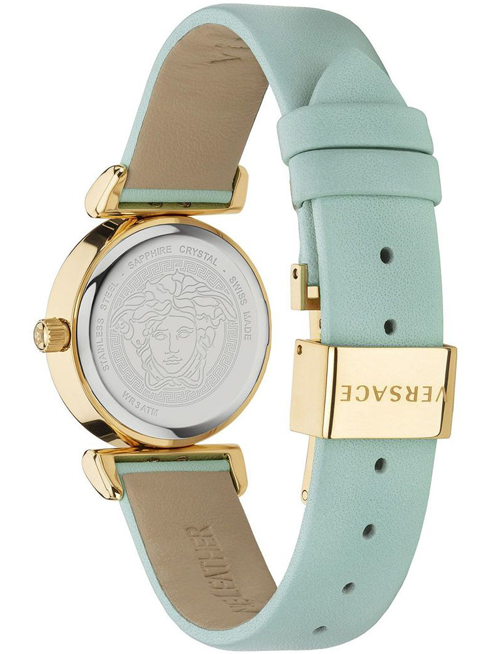 Brand: Versace • Manufacturer no.: VEAA01120 • Manufacturer series: Mini Vanity 27mm • Functions: Hour, Minute • Movement: Battery (quartz) • Movement label: Swiss Made • Dial color: Golden • Display: Analog • Water resistant: 3 • Bezel: Fixed • Surface finish: Matted, Polished • Case color: Gold • Case material: Stainless steel • Case thickness: 8 • Case shape: Round • Case width: 27 • Caseback: pressed, Stainless steel bottom • Gender: Ladies • Glas: anti-reflecting, Saphire glass • Style: Modern • Strap material: Calf leather • Strap color: Cyan • Lug width: 14 • Clasp: Buckle clasp • Max wrist circumferences: 190 • Item weight: 0.03