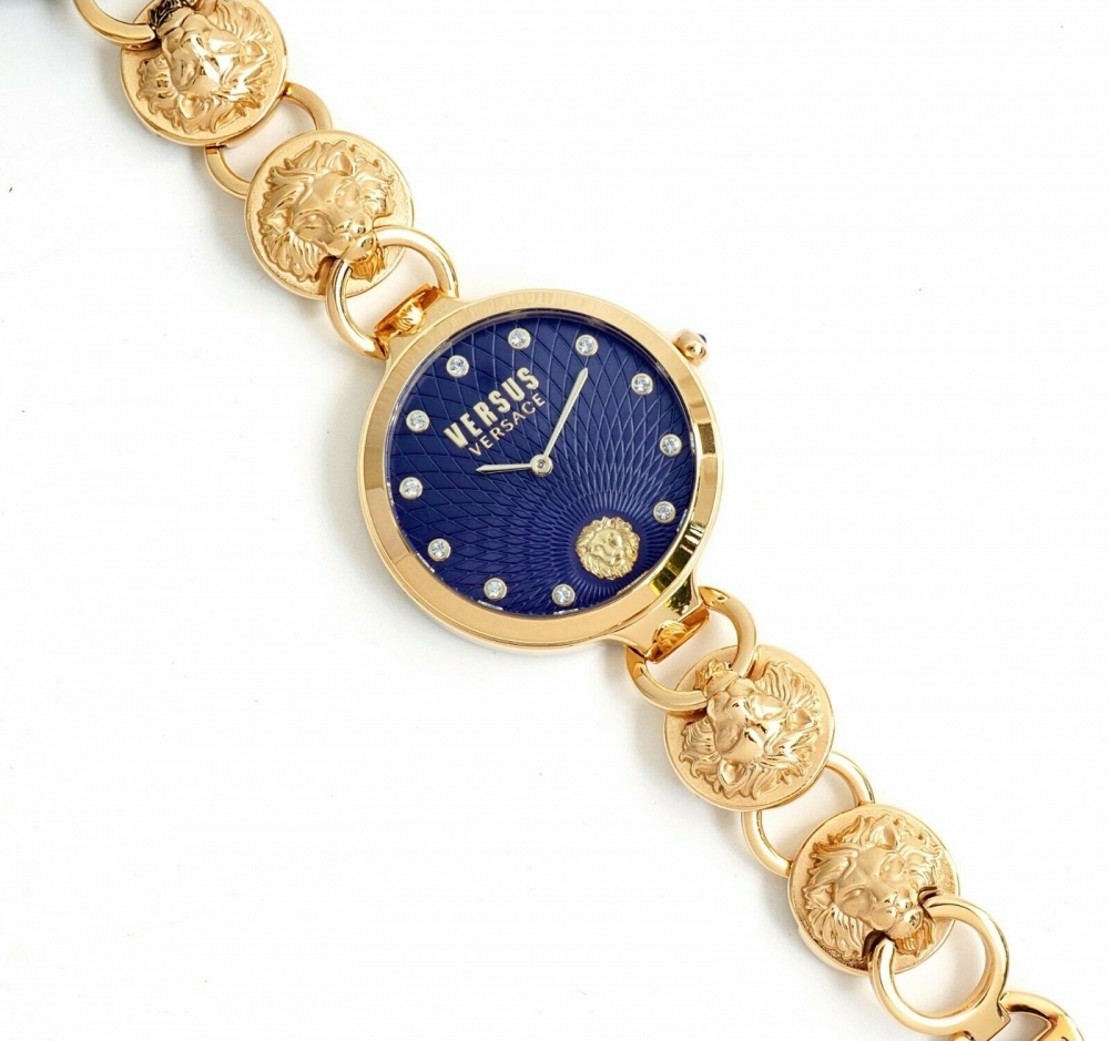 Brand: Versus by Versace • Manufacturer no.: VSP272620 • Manufacturer series: Broadwood 34mm • Functions: Hour, Minute • Movement: Battery (quartz) • Dial color: Blue • Display: Analog • Water resistant: 5 • Bezel: Fixed • Surface finish: Matted, Polished • Case color: Gold • Case material: Stainless steel • Case thickness: 9 • Case trimming: Swarovski • Case width: 34 • Caseback: pressed, Stainless steel bottom • Gender: Ladies • Glas: hardened, Mineral glass • Style: Fashion • Strap material: Stainless steel • Strap color: Gold • Lug width: 9 • Clasp: Clip clasp • Max wrist circumferences: 190 • Item weight: 0.07