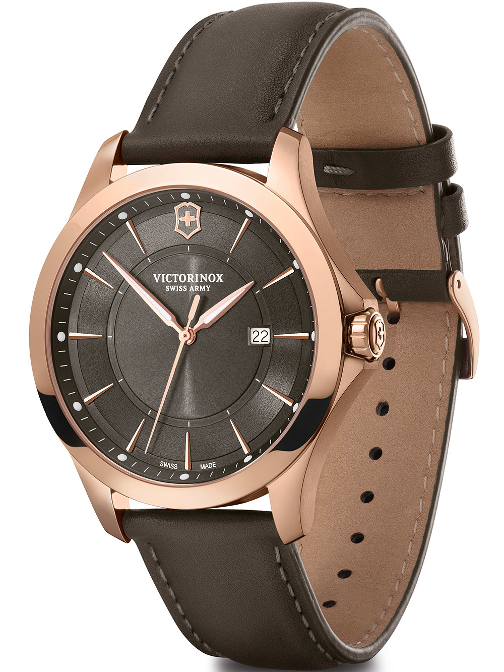 • Manufacturer no.: 241908 • Manufacturer series: Alliance 40mm • Functions: Date, Hour, Minute, Second • Movement: Battery (quartz) • Dial color: Grey • Display: Analog • Water resistant: 10 • Bezel: Fixed • Surface finish: Matted, Polished • Case color: Rosé gold • Case material: Stainless steel • Case thickness: 9 • Case width: 40 • Caseback: screwed, Stainless steel bottom • Gender: Mens • Glas: anti-reflecting, Saphire glass • Lighting: Illumin. hands, Illumin. indexes • Style: Sporty • Strap material: Calf leather • Strap color: Grey • Lug width: 20 • Clasp: Buckle clasp • Max wrist circumferences: 220 • Item weight: 0.06