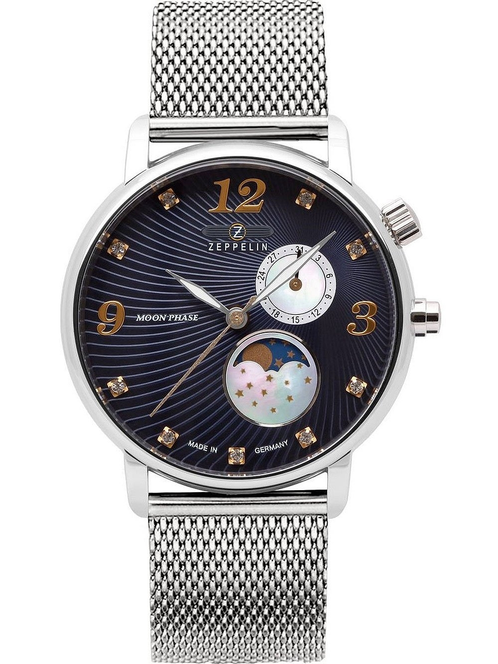 Brand: Zeppelin • Manufacturer no.: 7637M-3 • Manufacturer series: Luna moon phase 35mm • Functions: Date, Hour, Minute, Moon phase, Second • Movement: Battery (quartz) • Movement label: 706B, Ronda • Dial color: Blue • Display: Analog • Water resistant: 5 • Bezel: Fixed • Surface finish: Polished • Case color: Silver • Case material: Stainless steel • Case thickness: 12 • Case shape: Round • Case trimming: Swarovski • Case width: 35 • Caseback: pressed, Stainless steel bottom • Gender: Ladies • Glas: hardened, Mineral glass • Style: Classic • Strap material: Stainless steel • Strap color: Silver • Lug width: 18 • Clasp: Clip clasp • Max wrist circumferences: 190 • Item weight: 0.07